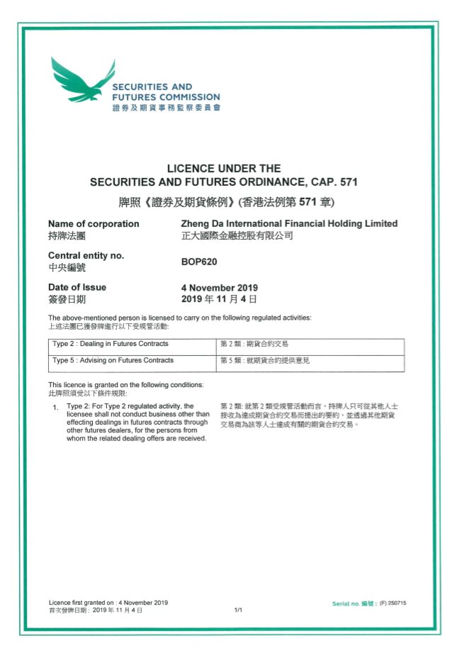 正大国际金融控股有限公司(ZHENG DA INTERNATIONAL FINANCIAL HOLDING LIMITED)。正大期货为香港证监会辖下之持牌法团(正大期货中央编号:BOP620), 正大期货从事第2类及第5类受规管活动即期货合约交易及就期货合约提供意见,正大国际期货主要从事商品期货经纪、金融期货经纪业务。